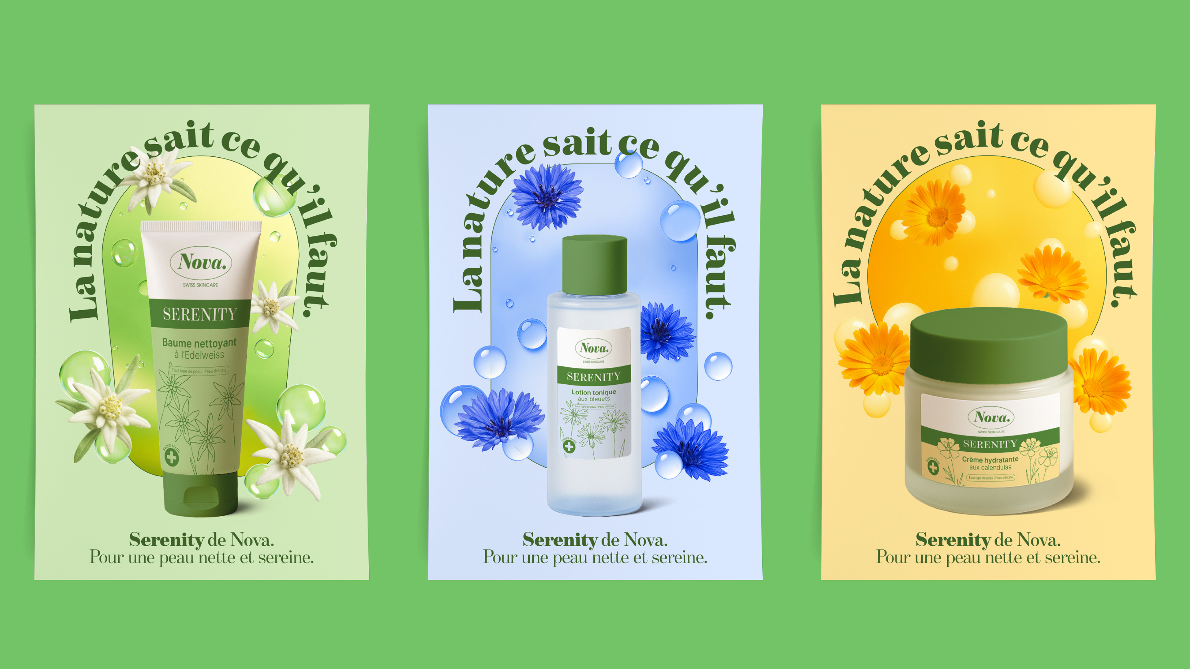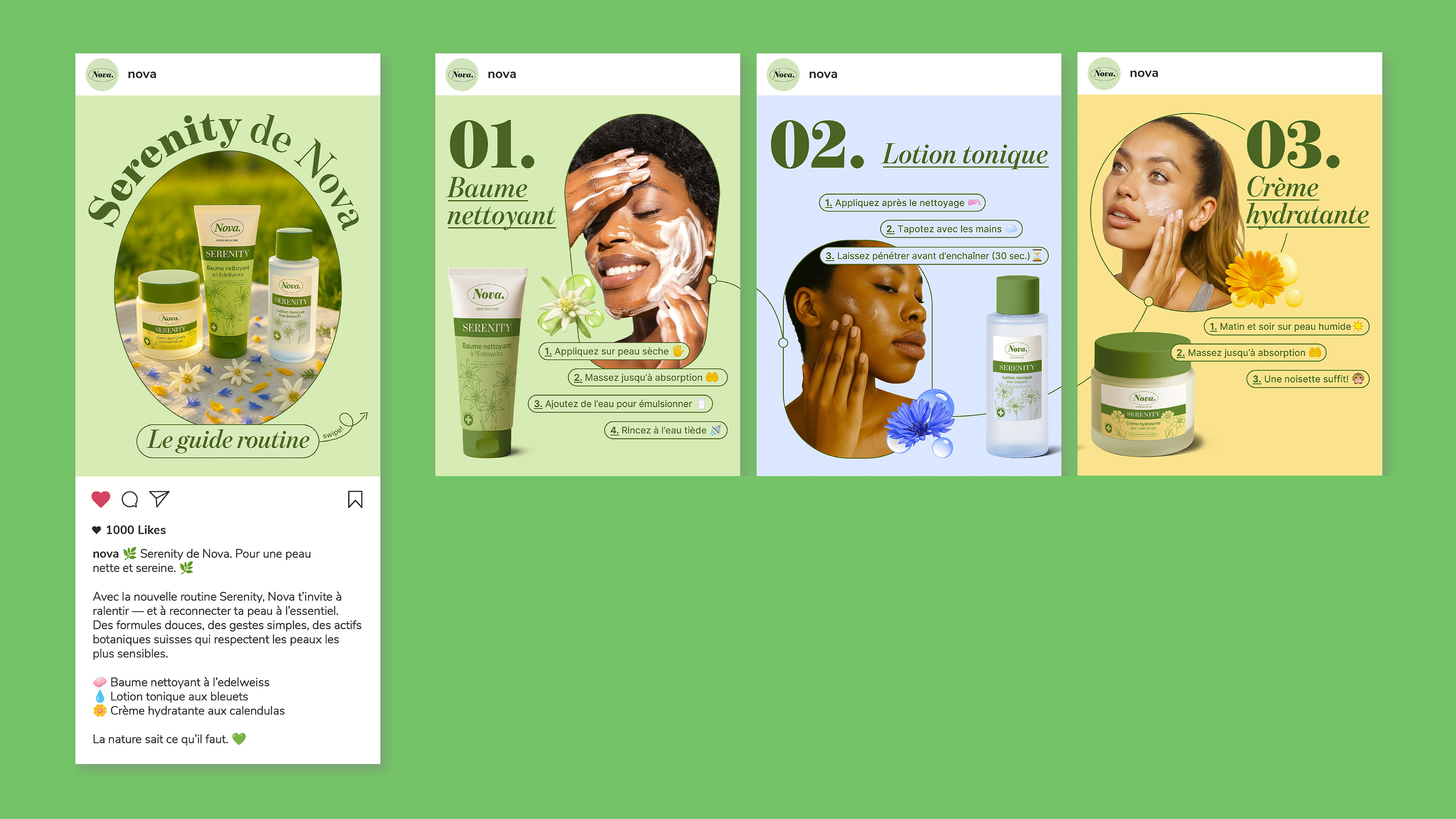 Création de packagings, visuels produits, supports imprimés et posts Instagram pour une marque fictive de cosmétiques naturels, fabriqués en Suisse.